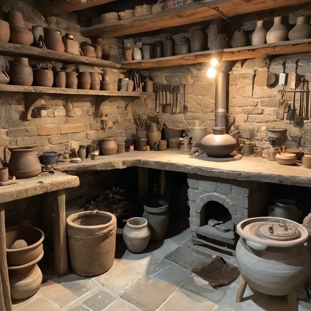 Подземная мастерская — это помещение, построенное ниже уровня земли, специально оборудованное для изготовления и обработки керамики. Чаще всего сюда входят рабочая зона с гончарным кругом, зона с материалами и печь для обжига. Основная особенность — стабильная температура и влажность, что положительно влияет на технологические процессы.