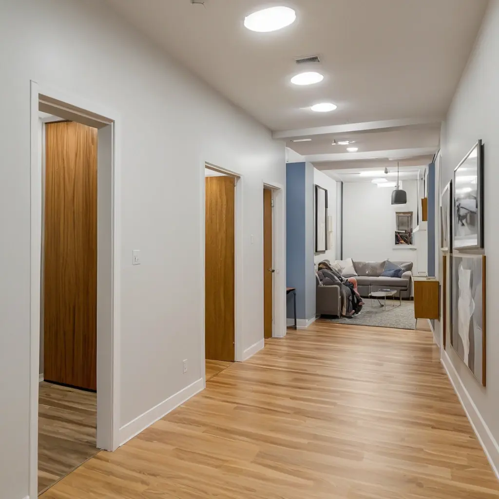 Для людей с нарушениями зрения важен правильный контраст между поверхностями. Светлые стены и темные дверные проемы, контрастная разметка ступеней и перил способствуют улучшению ориентации.